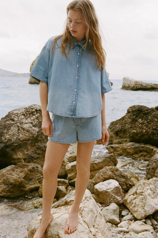 AgotadoCAMISA CROP MEZCLILLA TRF
